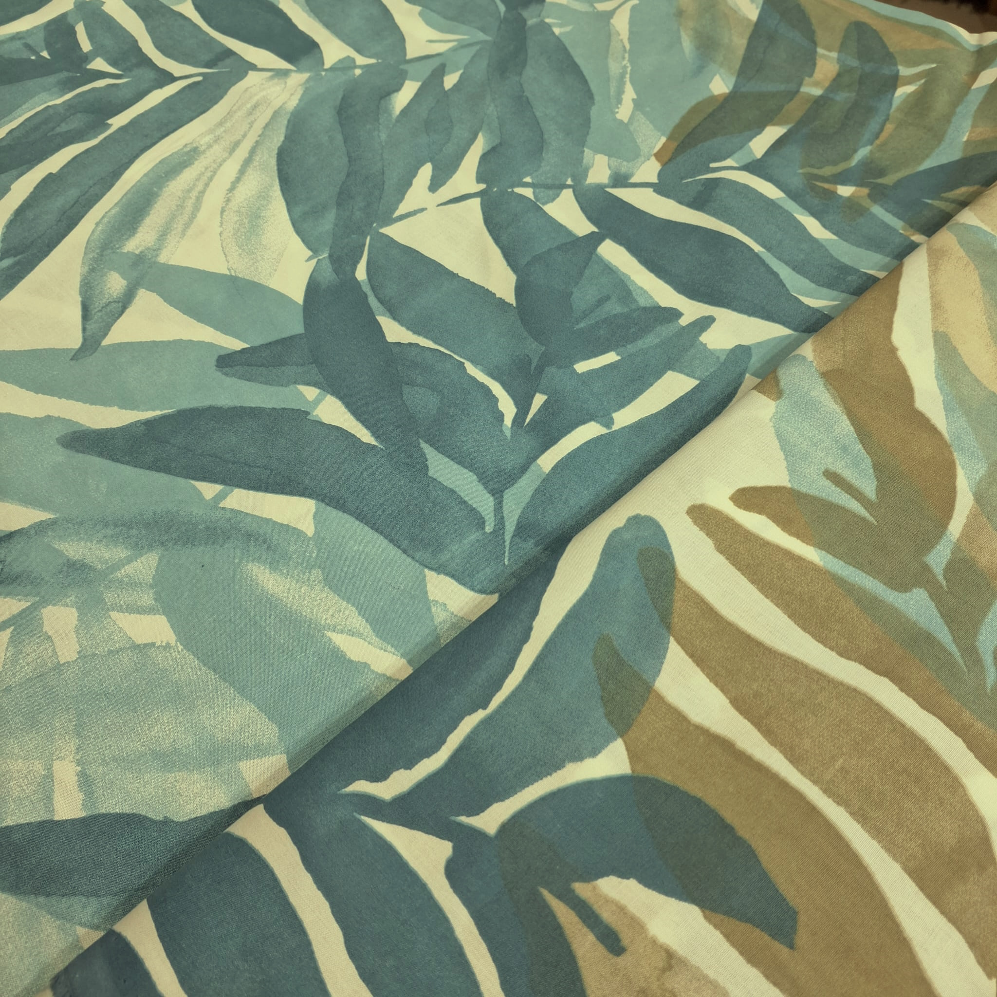 large teal blue and beige leaves on white wide cotton