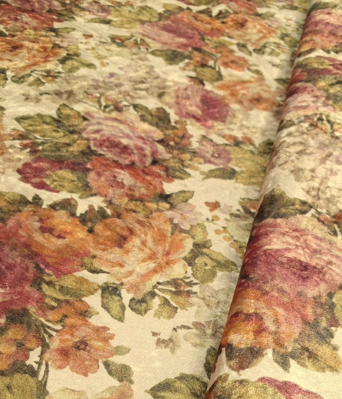 בד קטיפה בצבע שמנת, הדפס פרחים צבעוניים.