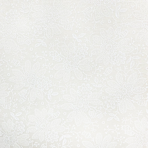 בד כותנה לבן, הדפס עלים ופרחים לבנים.