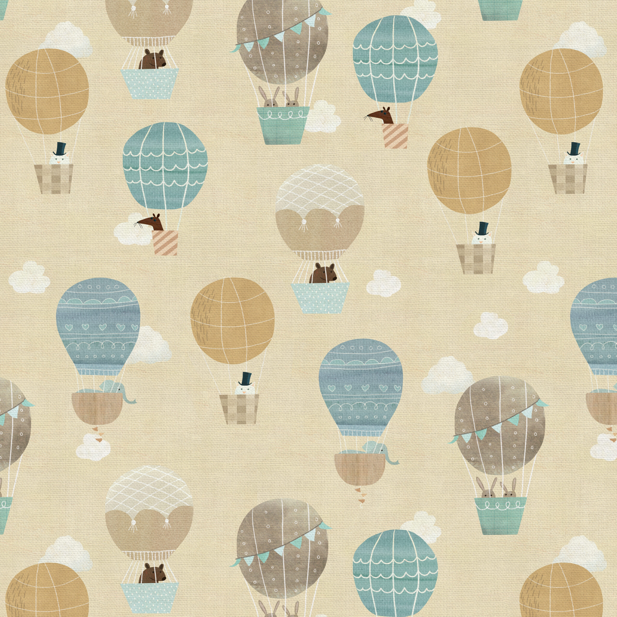 בד כותנה, הדפס ילדותי של חיות בכדורים פורחים.