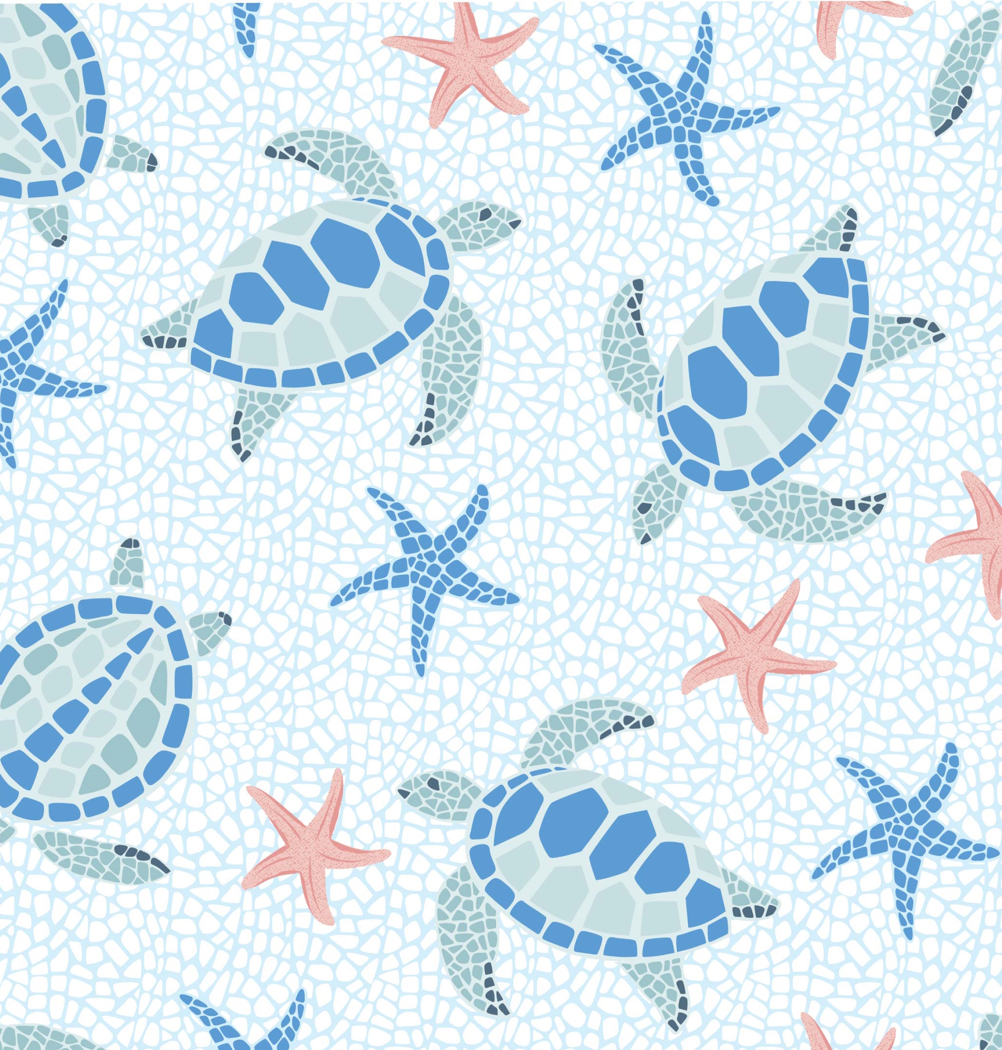 אריג 100% כותנה אורגנית בצבע כחול ולבן עם הדפס צבים כחולים וכוכבי ים ורודים על רקע פסיפס.