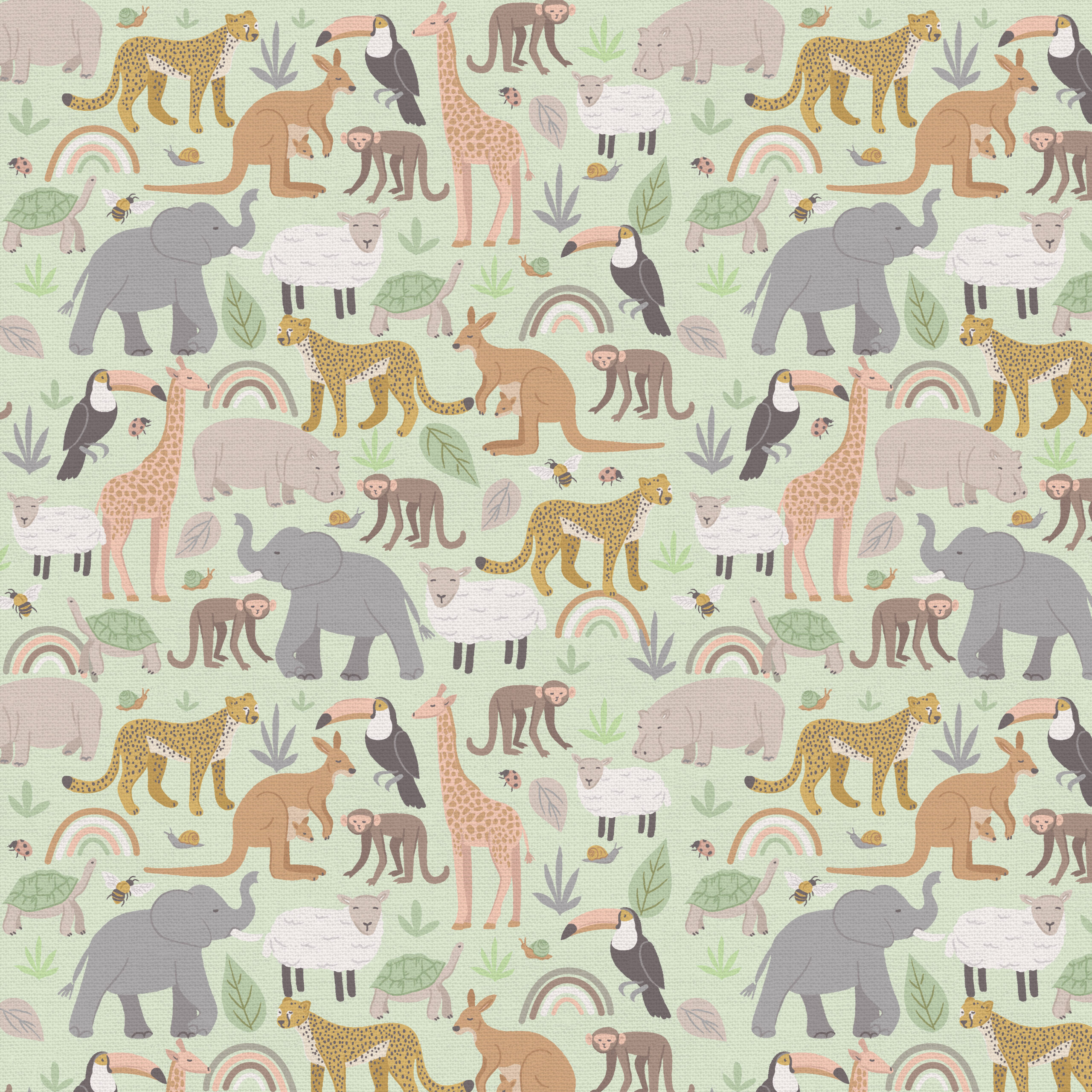 בד כותנה ירוק חיוור, הדפס ילדותי של חיות.