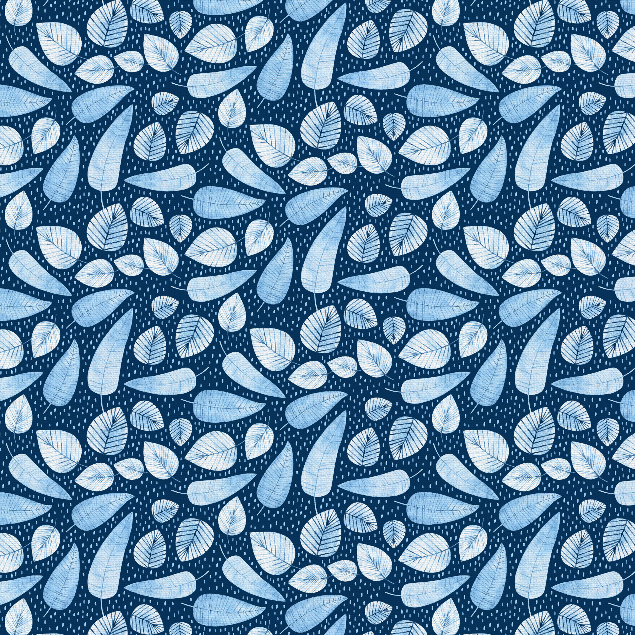 בד כותנה כחול כהה מנוקד, הדפס עלים בגווני תכלת.
