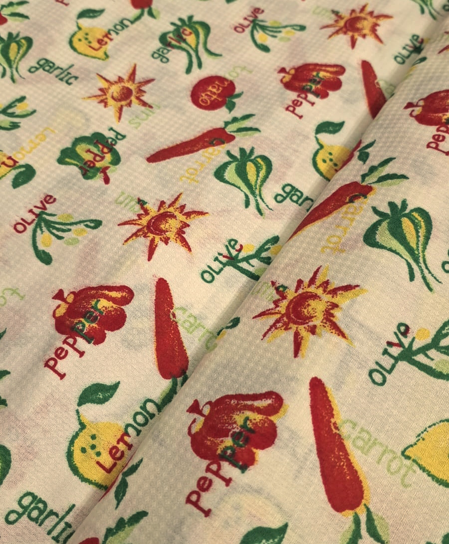 פיקה דק בהדפס שמש וירקות בגווני אדום ירוק וצהוב.